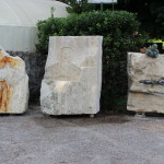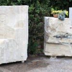 Blocco informe in travertino lavorato a mano con vaschetta e scultura “bocca della verità”